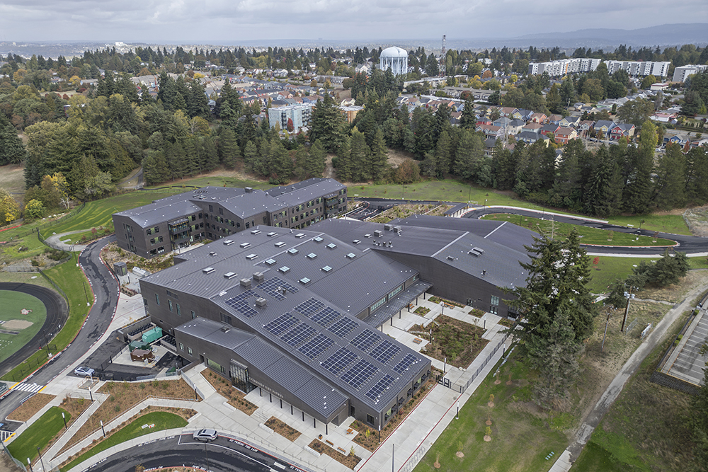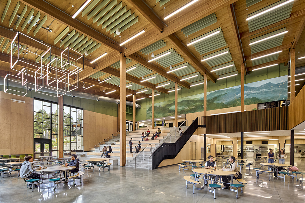 Expansive windows, basalt-colored exteriors, broadly sloped rooflines and warm mass timber create a powerful Northwest identity at this 220,000 SF replacement high school campus for Highline Public Schools. The academic building and activity building are connected with a pedestrian sky bridge that allows students to move across campus without needing to brave the Seattle drizzle. The academic building’s structural system uses a combination of cross-laminated timber (CLT) floor panels, glu-lam beams and columns, and steel buckling restrained brace (BRB) frames for the greatest balance of budget and user experience impact. At the activity building, a combination of steel and mass timber framed roof areas with BRB frames and masonry shear walls helps to create a unified design aesthetic. The comprehensive high school includes program space for CTE learning, 325-seat auditorium, library, competition and auxiliary gymnasiums, PE spaces, and administrative support space.