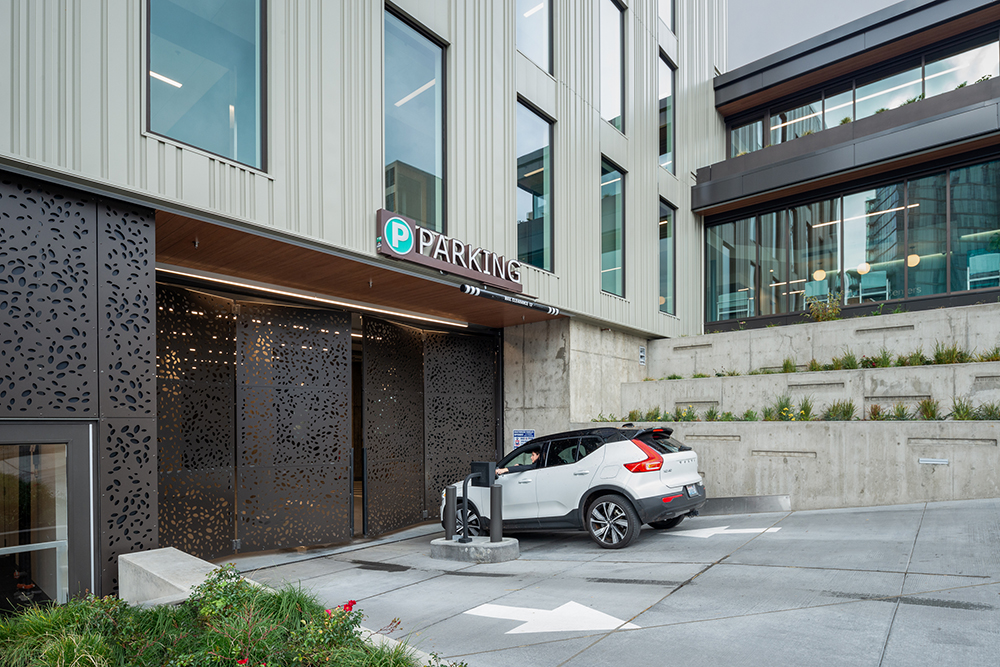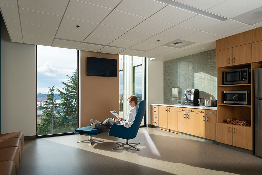 Treatment areas showcase views of downtown Seattle and Elliot Bay via the bands of glass around the building that channel natural light into the space. An off-street covered entryway streamlines patient dropoff and pickup, and an on-site garage offers secure parking for patients and staff.